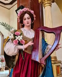 Sus atributos son el órgano, el laúd y las rosas.[cita requerida]